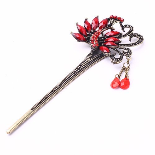 Yazilind Peacock fleur d'oiseau chanceux Totem Red Rhinestone perle en laiton antique en metal epingle acheveux de baton Accessoire de Ancient Chinese femmes pour les cheveux longs